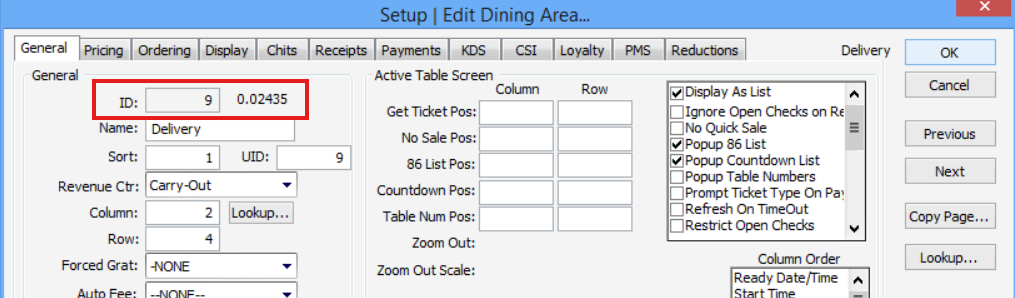 - First, determine the dining area ID in Manager Console Setup > Revenue Source Setup > Dining Area , then selecting a dining area and selecting Edit.