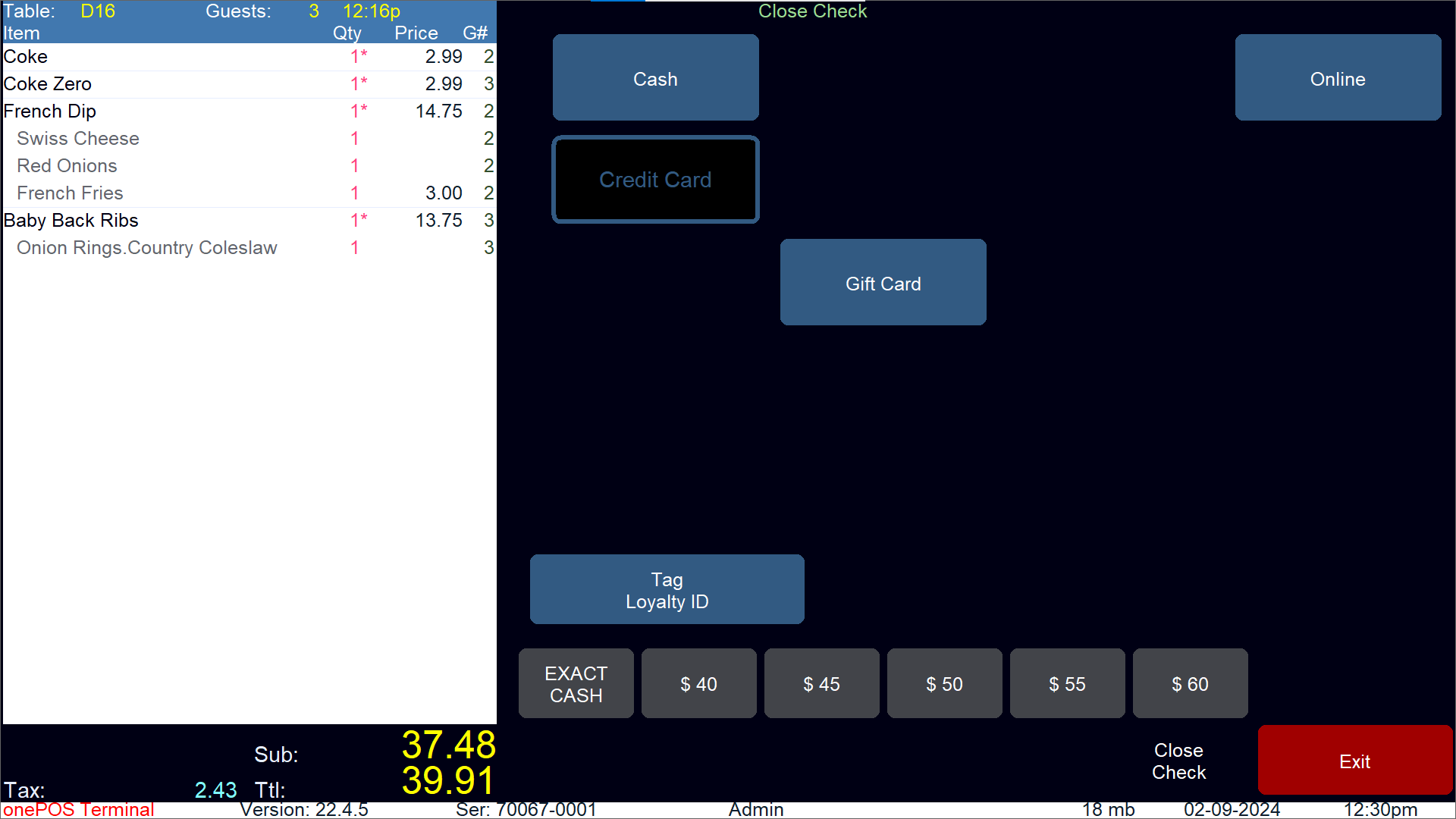 - Close out with the desired payment method. After you have closed out this split, you will be returned to the rest of the check to finish closing out.