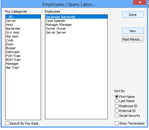 The next step is to select the employee is question and click view. (If for some reason the employee in question has been terminated since the date of the time punch then you can check the "Show Terminated" check box at the bottom of this screen to be able to find them.)