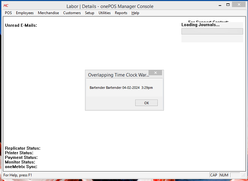 (In this example the "In Time" of 3:29pm overlaps with the "Out Time" of 3:30pm for that same date. Simply change the in time to 3:31pm and the error message will no longer appear when trying to execute labor based function.