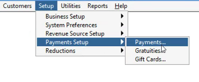 To set up we first want to create a "Tip Fee" percentage. To do this we are going to go into set up then payment setup and then payments.