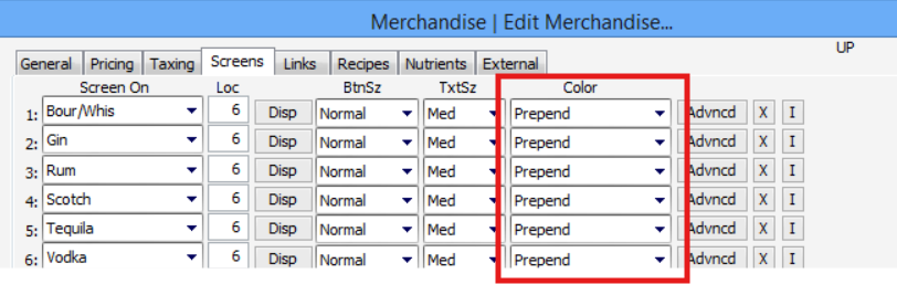 The onePOS software is hard coded to have an item with the name "UP" be displayed as an up arrow. This is typically used as a prepend for screengroups that contain alcoholic beverages as an up-charge button.
